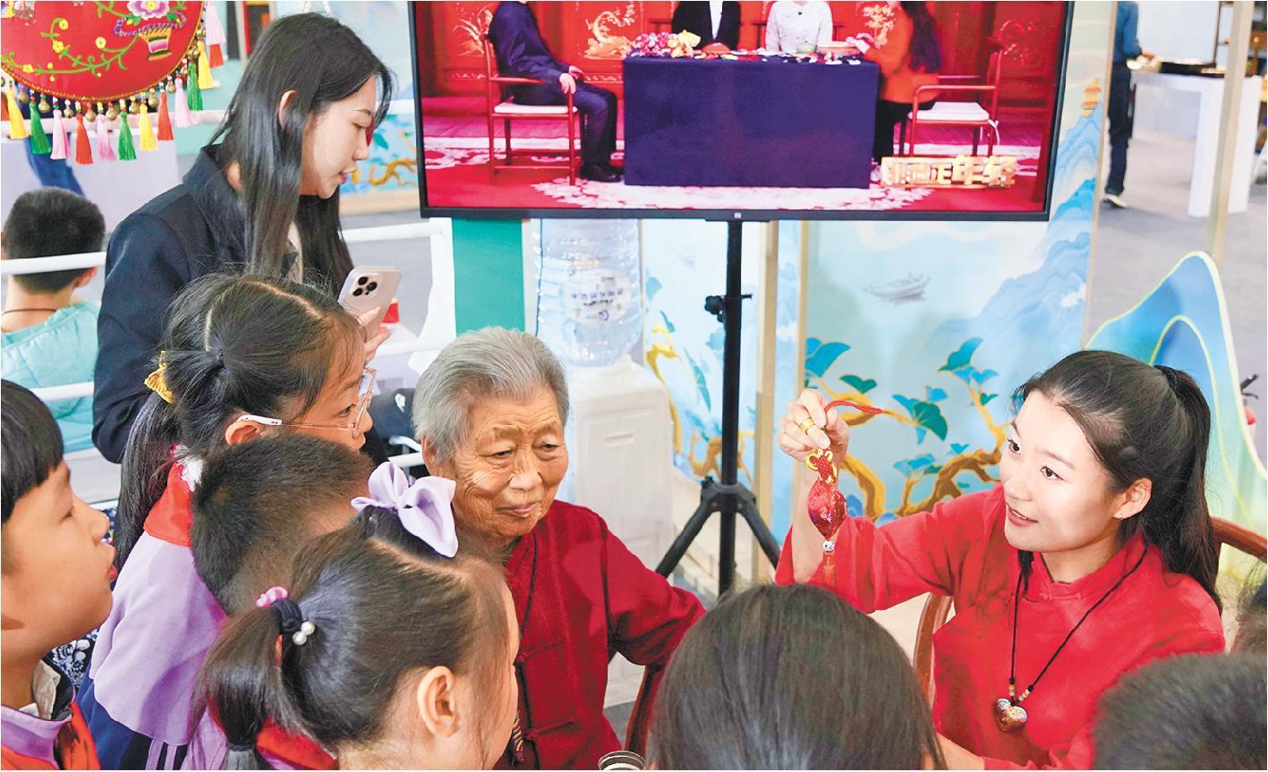 在第八屆中國非物質文化遺產博覽會上,孫歌堯和王秀英給孩子們講解香包制作方法。(□記者孫業文報道)