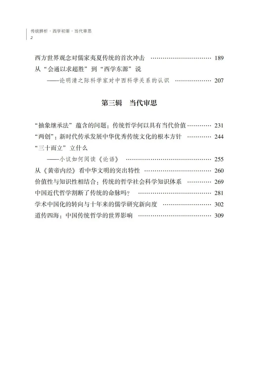 本書是關于儒學和傳統思想的論文集。按照內容分為三輯,第一輯傳統辨析,共九篇文章,前四篇是個案分析,后五篇是專題綜論;第二輯西學初漸,共五篇文章,論述了明清之際西學初次影響中國對原有傳統的沖擊,以及不同觀念的比照和交匯;第三輯當代審思,共八篇文章,論述了傳統文化在當代中國創造性轉化和創新性發展的若干問題。