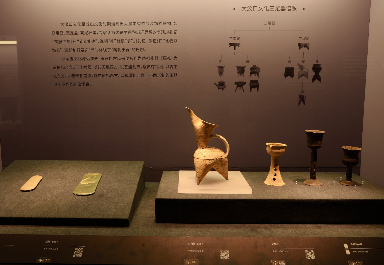 山東曲阜出土的大汶口文化時期的白陶鬹、黑陶高柄杯、玉鉞等展示。