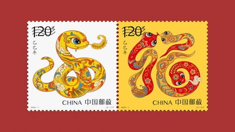 我國從1980年開始發行生肖郵票以來,年年發行。2025年1月5日發行《乙巳年》生肖郵票,全套兩枚。第一枚圖名為“蛇呈豐稔”,畫面提煉了中華傳統文化中盤蛇的靈動意象,加以喜慶裝飾應和年節氛圍。金色的蛇軀蜿蜒,口中銜著一束“嘉禾”,象征著“倉廩實,衣食足”的美好圖景。第二枚圖名為“福納百祥”,畫面以草書筆意將三條蛇創意性地構成了“?!钡淖中?,簡練灑脫、柔美順通。兩大一小三條蛇之間情感細膩流動,顧盼生情,生動展現了闔家歡樂的溫馨場景,寓意著和合共生、福滿人間,寄托了人們對美好生活的無限追求與誠摯祈愿。