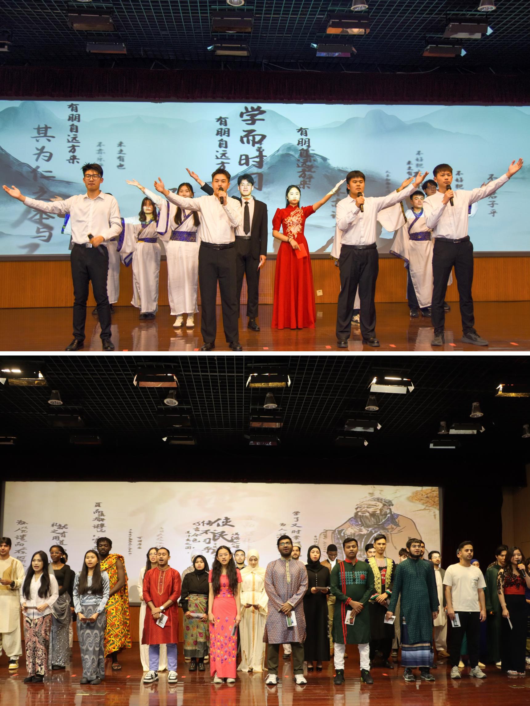 活動現場,中國石油大學(華東)文法學院、外國語學院的大學生們以及國際教育學院的留學生們用多語言誦讀《論語》經典篇章,通過豐富多元的藝術表現形式,對經典進行了創新演繹,將儒家深厚的文化底蘊融入現代舞臺表演。