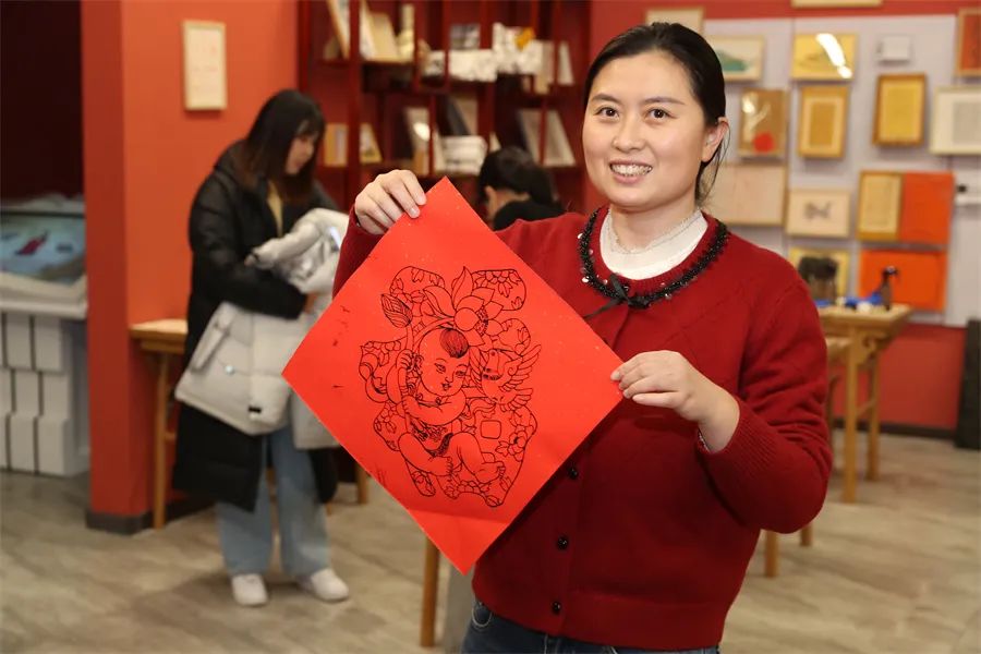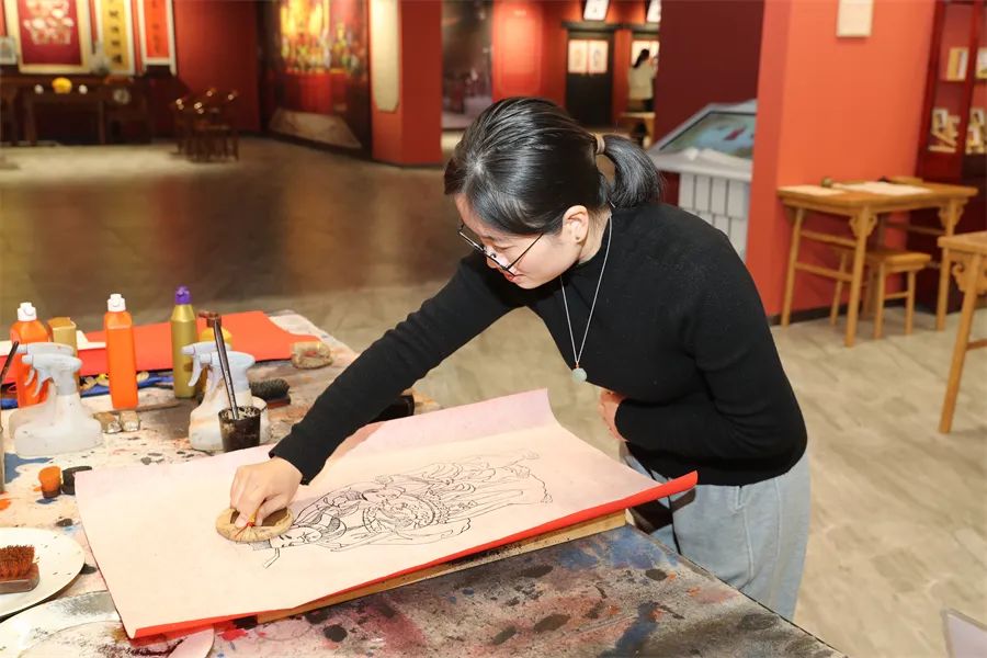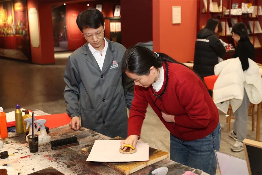 臘八過后,新年也就不遠了,人們也開始熱熱鬧鬧地進行著新年的準備,比如“蒸壯”、貼門神等等。在孔子博物館研學體驗中心(孔博書局),觀眾們一起進行《孔府年俗文化探究》課程,在老師帶領下,大家深入了解了臘八節、“蒸壯”、小年祭灶等習俗,并開始了門神及福字雕版印刷體驗。大家認真仔細地涂抹墨汁,鋪上紙張,然后輕輕按壓,一幅幅印有門神和福字的作品就這樣生動地呈現在大家的眼前。