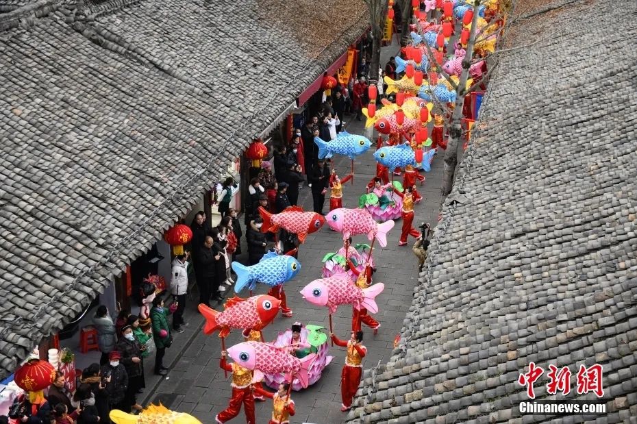 作為春節文化的發源地,四川閬中不僅保存著眾多與春節相關的歷史遺跡,更將這份傳統融入小城的每一個角落。圖為文藝工作者在閬中古城表演花燈節目。CNSphoto 王玉貴 攝