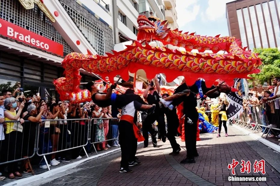 當地時間2024年2月24日,正值農歷甲辰龍年元宵,第十九屆歡樂春節游園會在巴西最大城市圣保羅啟幕,吸引數萬民眾同鬧元宵。圖為舞龍演員們疊羅漢炫技。中新社記者 林春茵 攝
