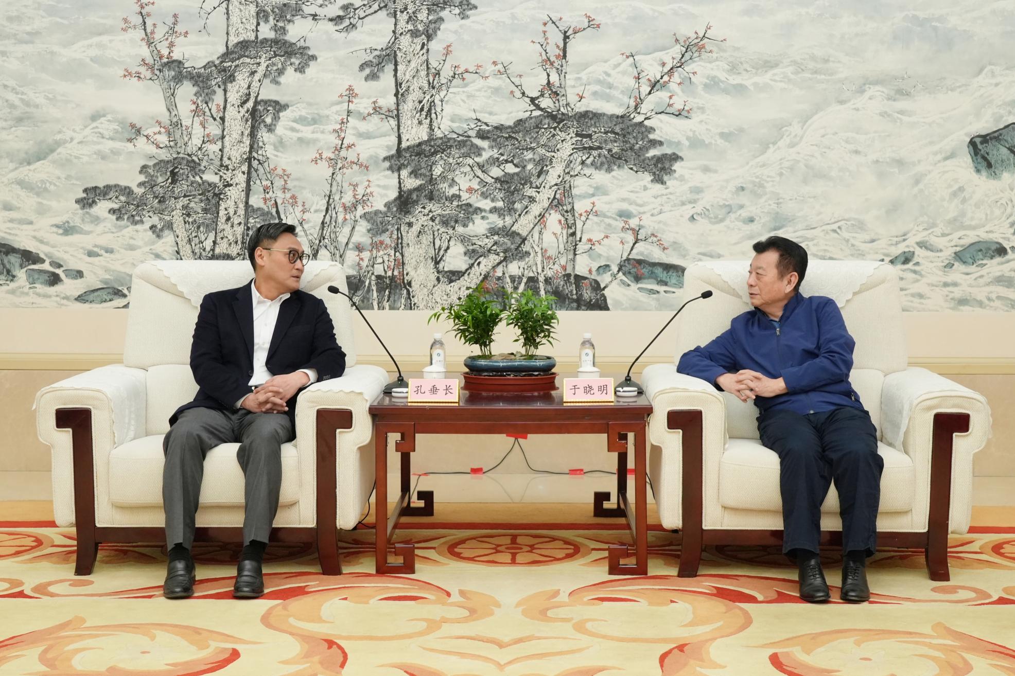 于曉明對孔垂長一行的到來表示熱烈歡迎,高度贊賞深圳至圣孔子基金會在弘揚儒家文化、推動文化交流方面所作出的積極貢獻。于曉明指出,孔子是儒家學派的創始人,其思想對中國乃至世界文化產生了深遠影響。作為孔子故里,山東省委、省政府高度重視中華優秀文化的傳承與發展,深入貫徹落實習近平文化思想和習近平總書記關于中華優秀傳統文化的重要論述,堅持“兩個結合”,推進“第二個結合”深化發展。中國孔子基金會肩負著弘揚儒家文化、推動學術交流的使命任務,積極開展學術研究、海外文化交流、漢學家訪學駐研等活動,推動中華優秀傳統文化走向世界。中國孔子基金會與深圳至圣孔子基金會長期保持密切合作,共同開展了兩岸孔子文化春會、祭孔典禮、成人禮等豐富多彩的文化活動,推動兩岸文化交流與民心相通,為中華文化的傳承與創新注入了新的活力。希望雙方進一步加強合作,在儒學學術研究、文化傳播、國際交流等領域探索更多務實舉措,共同為弘揚中華優秀傳統文化、促進世界文明交流互鑒作出更大貢獻。
