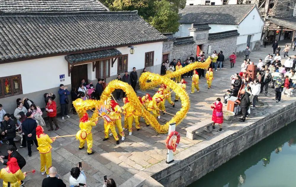 △2月10日,浙江湖州市德清縣新市古鎮舞龍表演。