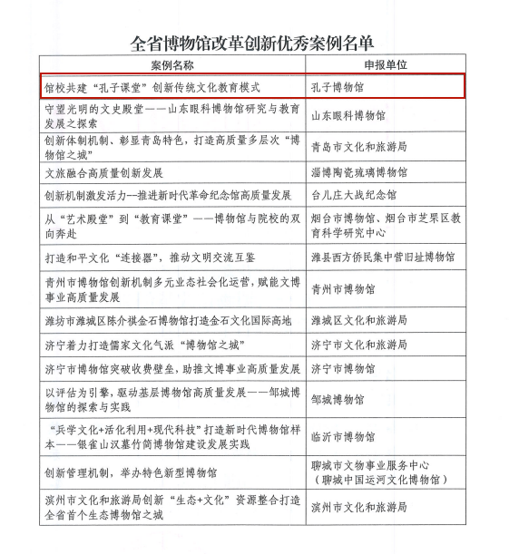 2月24日,山東省文化和旅游廳下發《關于2025年全省博物館改革創新優秀案例入選名單的通知》(魯文旅博﹝2025﹞1號),孔子博物館《館校共建“孔子課堂” 創新傳統文化教育模式》成功入選。