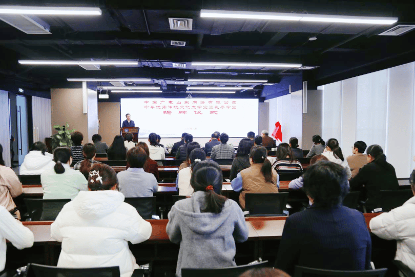 在中國廣電山東網絡有限公司,周靜與中國廣電山東網絡有限公司黨委書記、董事長謝寧共同為孔子學堂揭牌,并向中國廣電山東網絡有限公司贈送儒學經典圖書。授課環節,蔡恒奇帶領參會人員誦讀《論語·為政篇》,以《論語的價值和意義》為題進行了專題講座。結合當代社會治理與企業文化建設,深入闡釋《論語》對個人修養與國家發展的現實啟示。