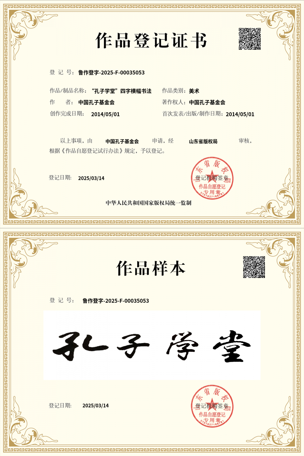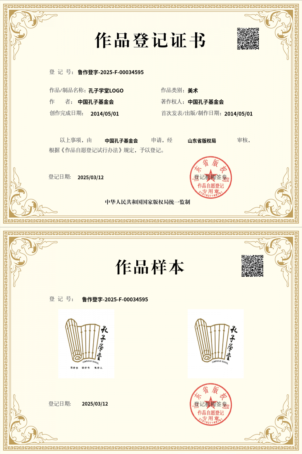近日,由中國孔子基金會申請的作品標識“孔子學堂LOGO”及“‘孔子學堂’四字橫幅書法”,經山東版權局審核,成功完成版權登記。該登記標志著孔子學堂核心文化符號獲得法律層面的專屬保護,進一步提升了依法興辦、推廣學堂的能力和水平,學堂的規范化建設邁上新臺階。