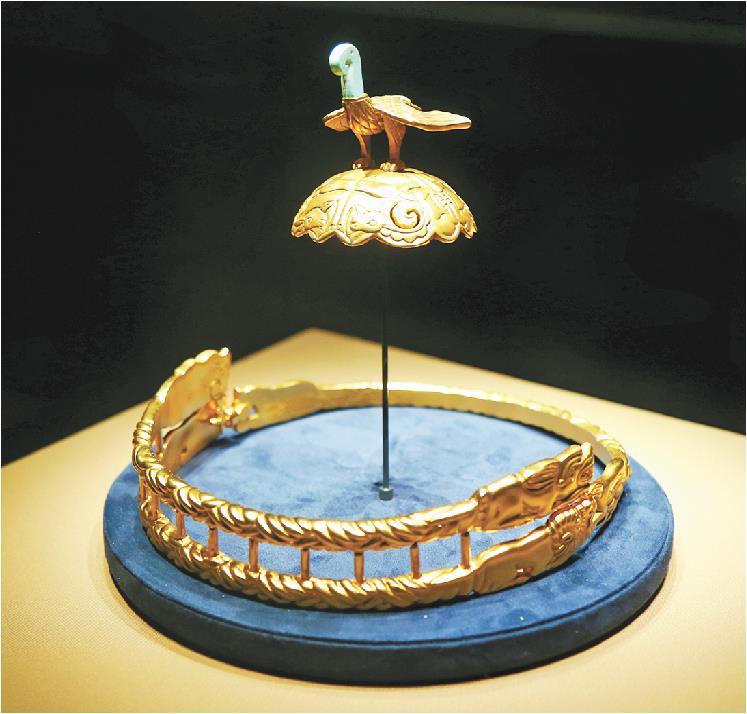 戰國時期的鷹頂金冠飾(此次展出的是復制件),是匈奴文物最有代表性的稀世珍品,是迄今所見唯一的“胡冠”,有“草原瑰寶”之譽。