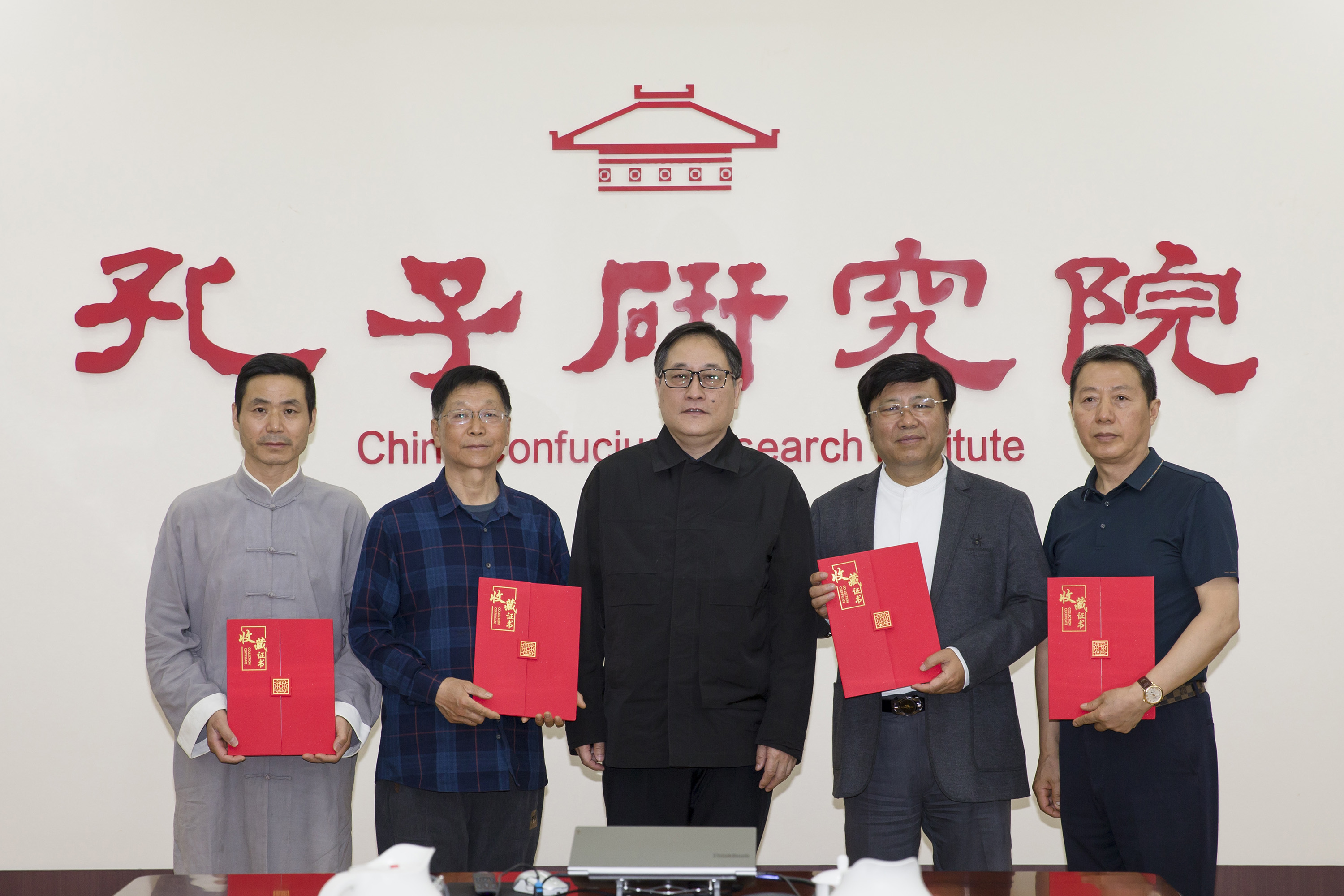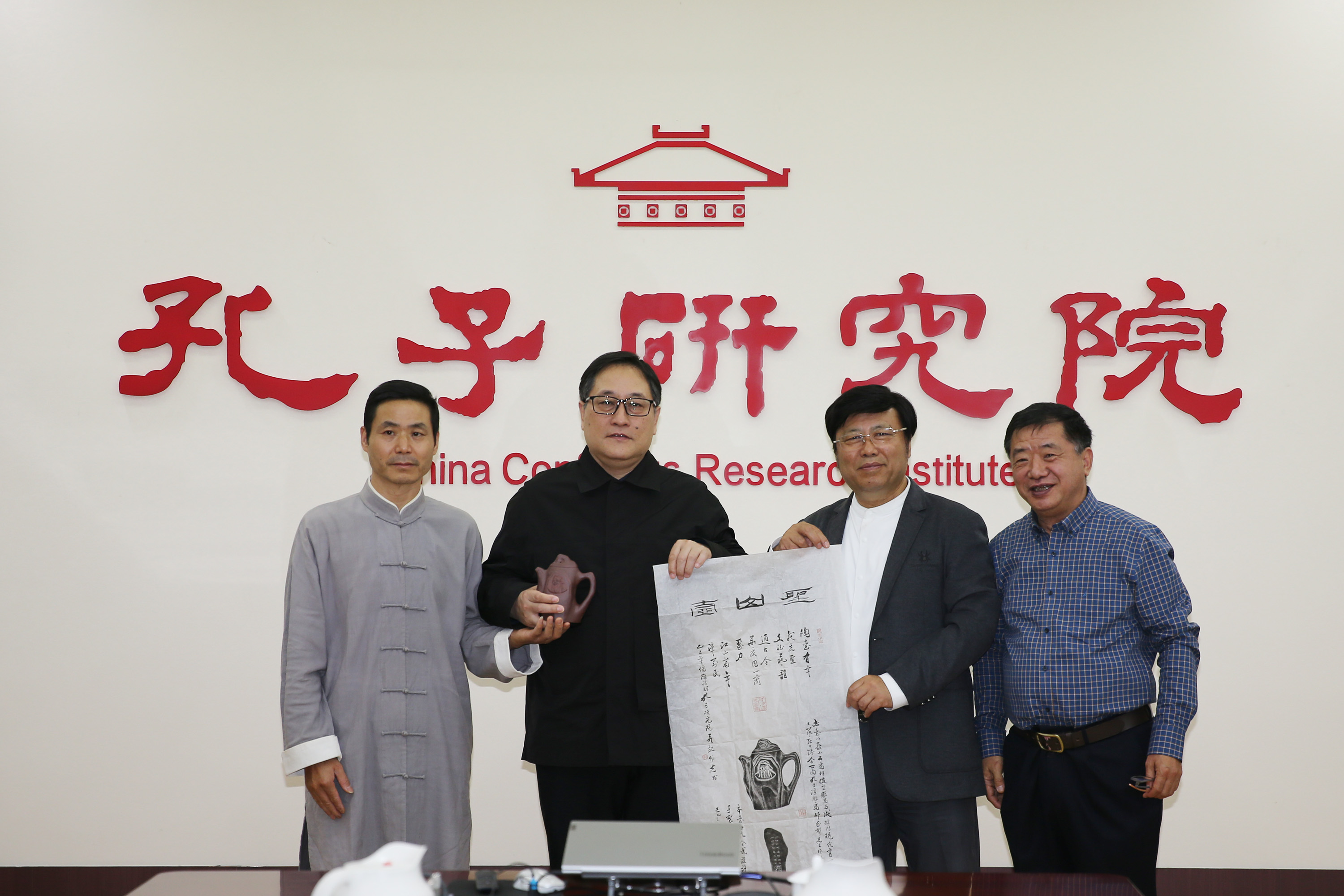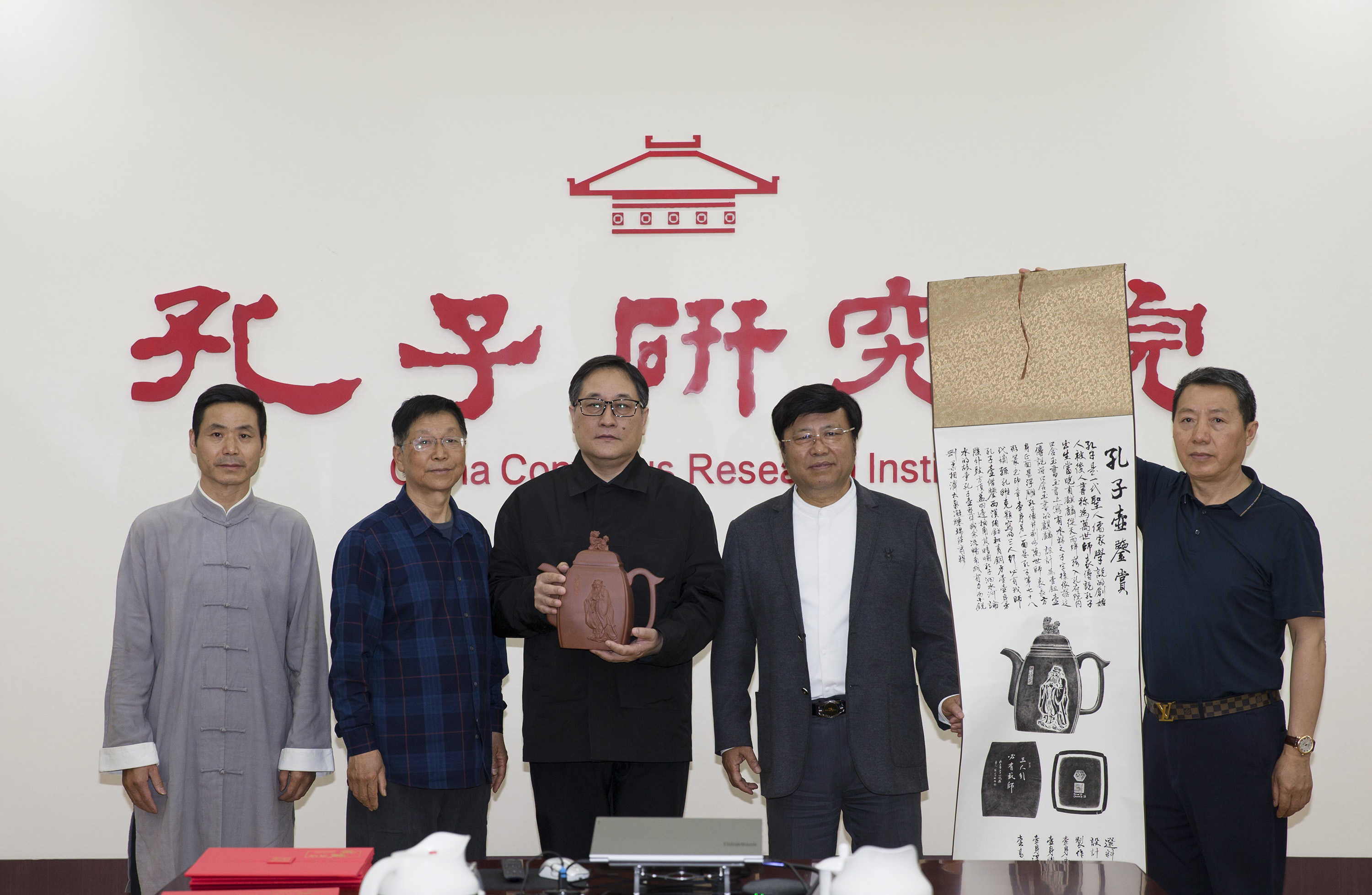 孔維克、吳建榮、季順林、孔令武向孔子研究院捐贈紫砂壺《孔子》及拓片題跋,劉續兵接收捐贈作品并回贈收藏證書。