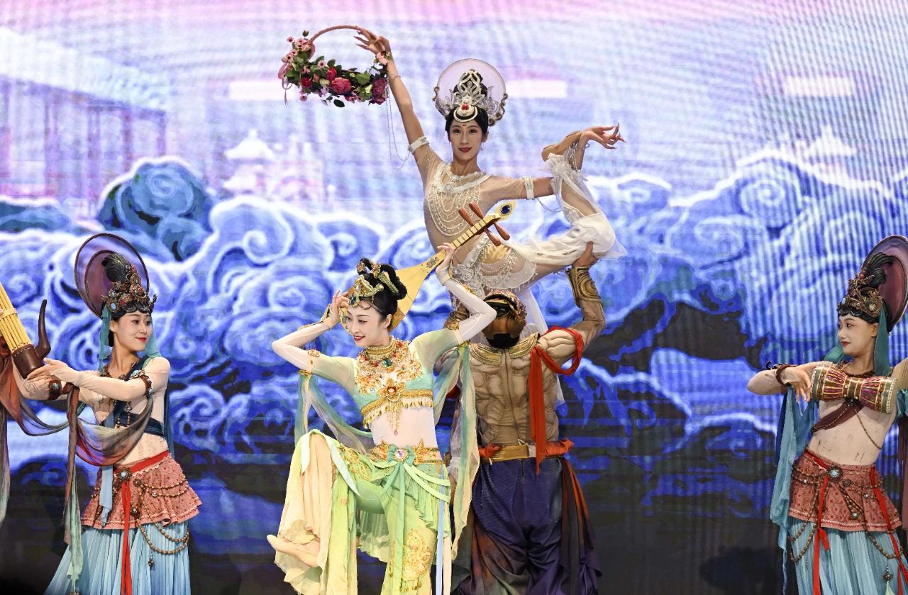△5月30日,在第四屆文明交流互鑒對話會的開幕式上,演員進行敦煌石窟文化藝術主題表演。新華社記者 張領 攝