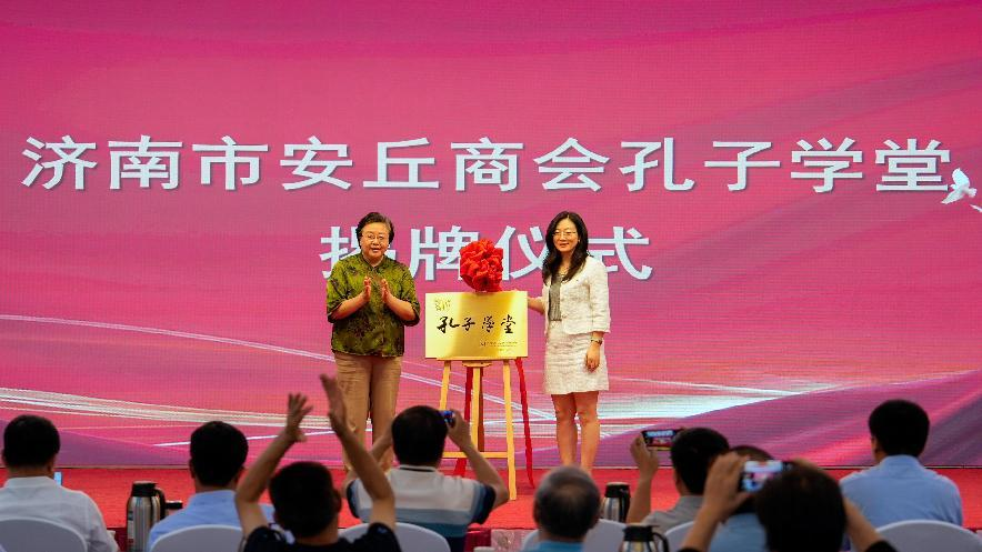周靜與商會黨支部書記周永輝共同為濟南市安丘商會孔子學堂揭牌。