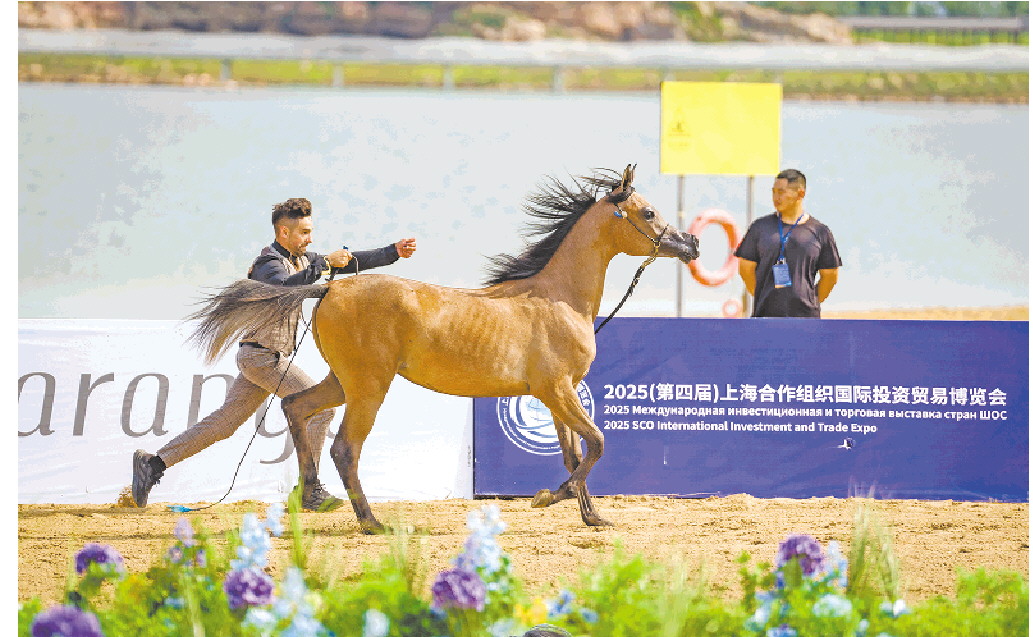 2025(第四屆)上海合作組織國際投資貿易博覽會配套活動——阿聯酋阿拉伯馬環球杯(中國站)上,牽馬師正牽著阿拉伯馬在比賽場地中奔跑。