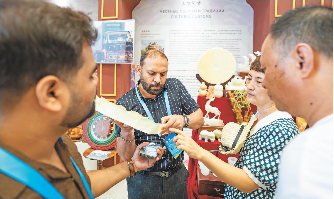 2025(第四屆)上海合作組織國際投資貿易博覽會上,游客正在巴基斯坦館選購商品。