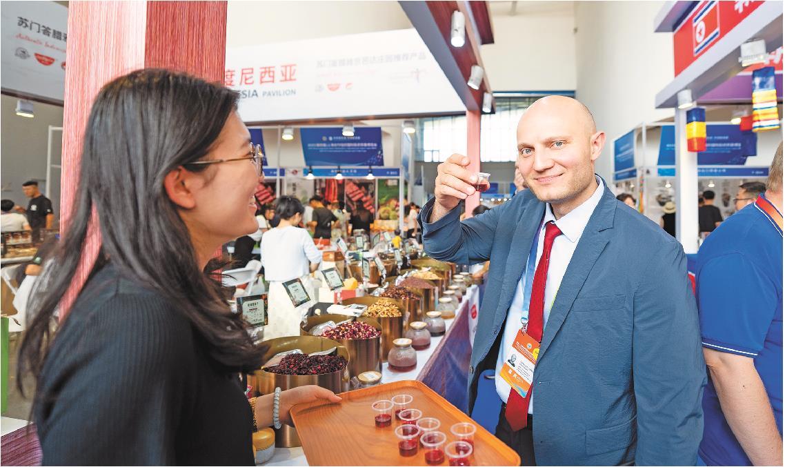 2025(第四屆)上海合作組織國際投資貿易博覽會上,來自俄羅斯的外賓巴沙正在品嘗源自印尼的花茶。