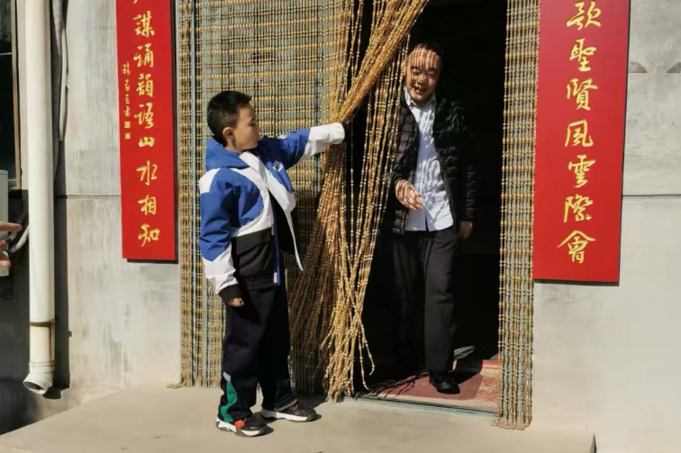 楊海文教授來授課時,趙藝森和潘一博在臨近下課前悄悄跑到了一樓門口,見教授走下樓來,兩個孩子默契地伸出小手,輕輕為他掀開門簾,用行動詮釋著“尊師重道”。