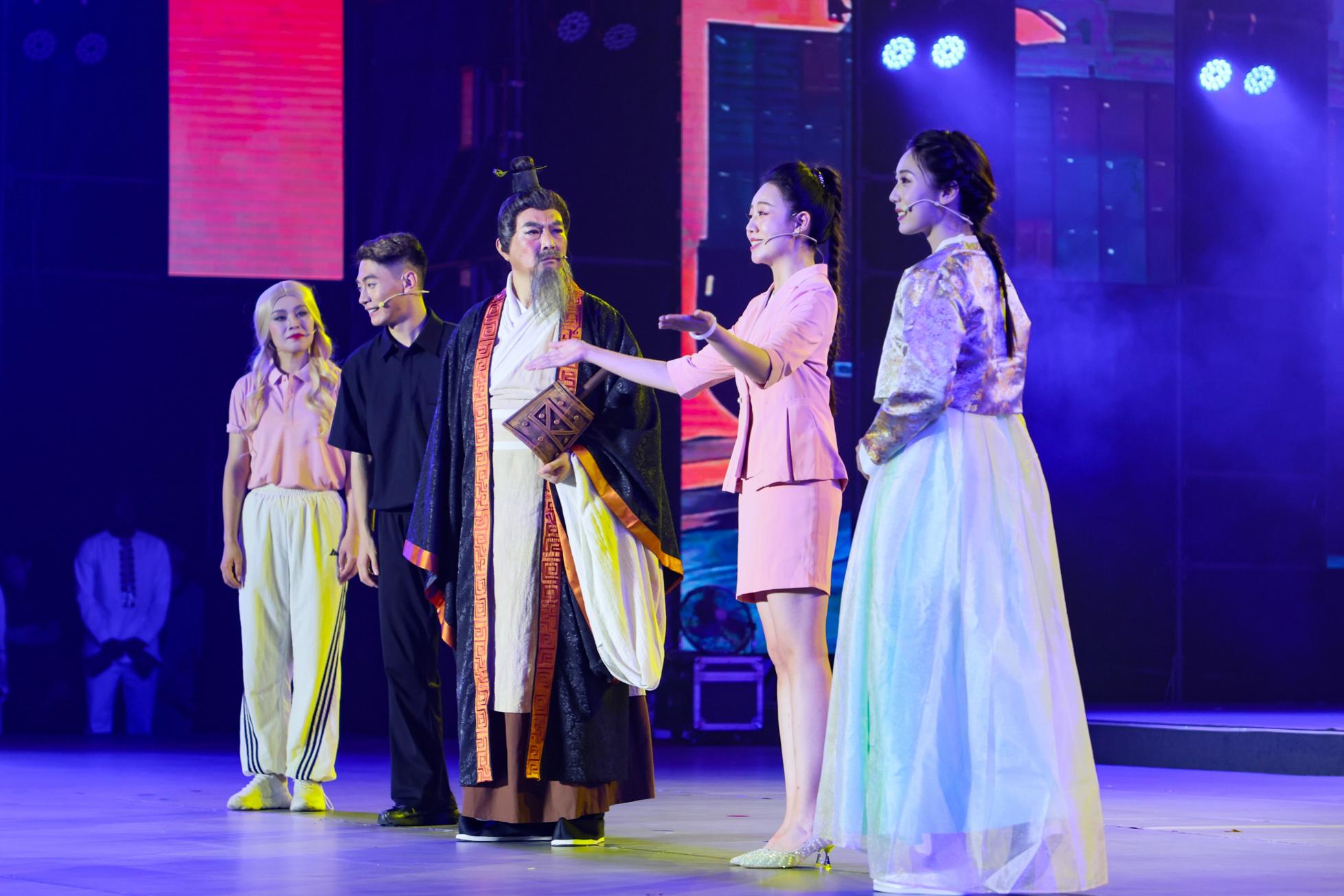 古琴雅樂與現代交響的跨界碰撞,悠揚琴音與激昂樂章交織,仿佛穿越時空的對話;LED動態背景與激光投影的科技賦能,讓舞臺在春秋杏壇、大唐長安與當代會場間自如切換,逼真而絢麗;深衣儒服的莊重典雅與中亞袍服的異域風情相映成趣,訴說著文化的多元與包容。