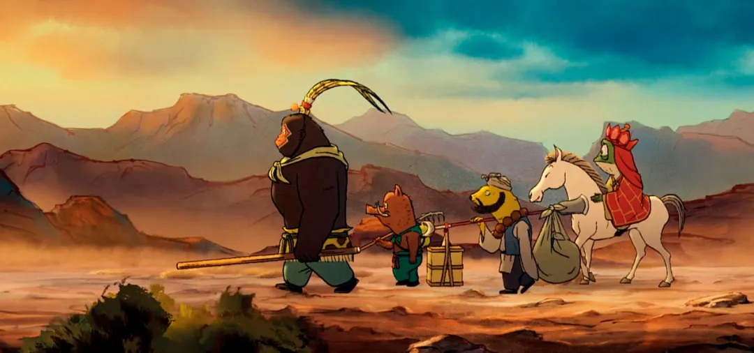 水墨氤氳的群山間,四個笨拙的小妖怪身披破舊袈裟,扛著自制的金箍棒、釘耙,在夕陽下踏上了荒誕的“取經路”。