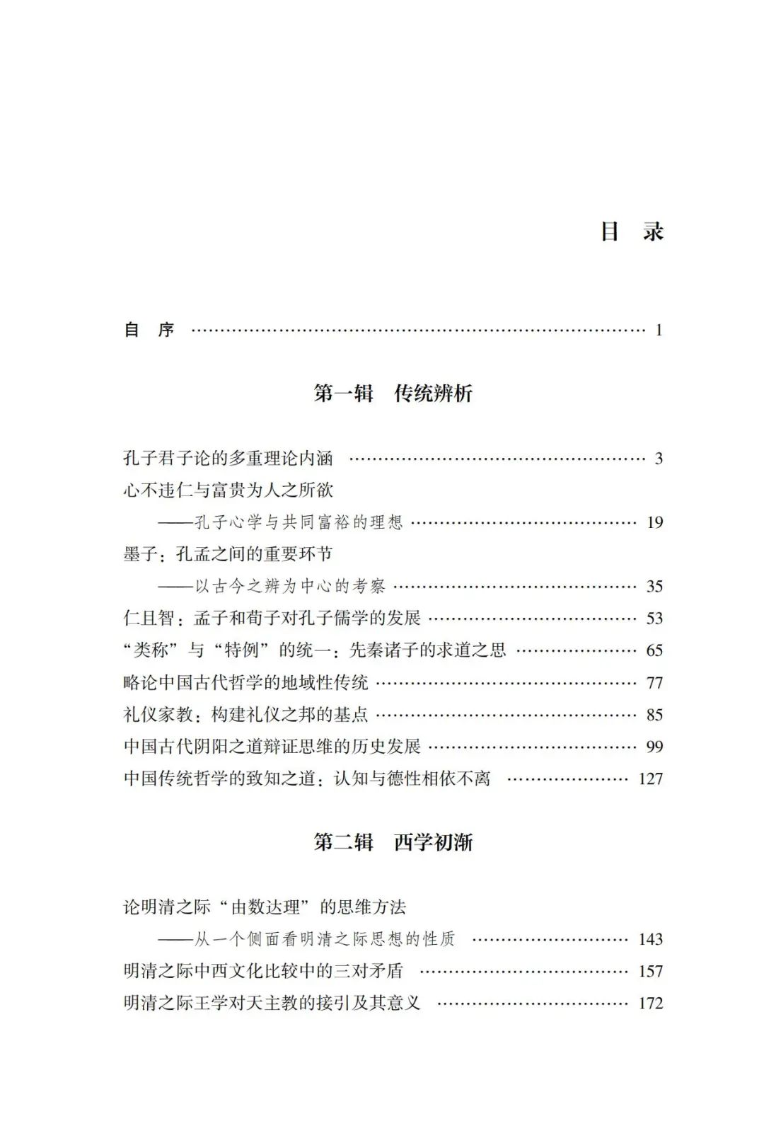 本書是關于儒學和傳統思想的論文集。按照內容分為三輯,第一輯傳統辨析,共九篇文章,前四篇是個案分析,后五篇是專題綜論;第二輯西學初漸,共五篇文章,論述了明清之際西學初次影響中國對原有傳統的沖擊,以及不同觀念的比照和交匯;第三輯當代審思,共八篇文章,論述了傳統文化在當代中國創造性轉化和創新性發展的若干問題。