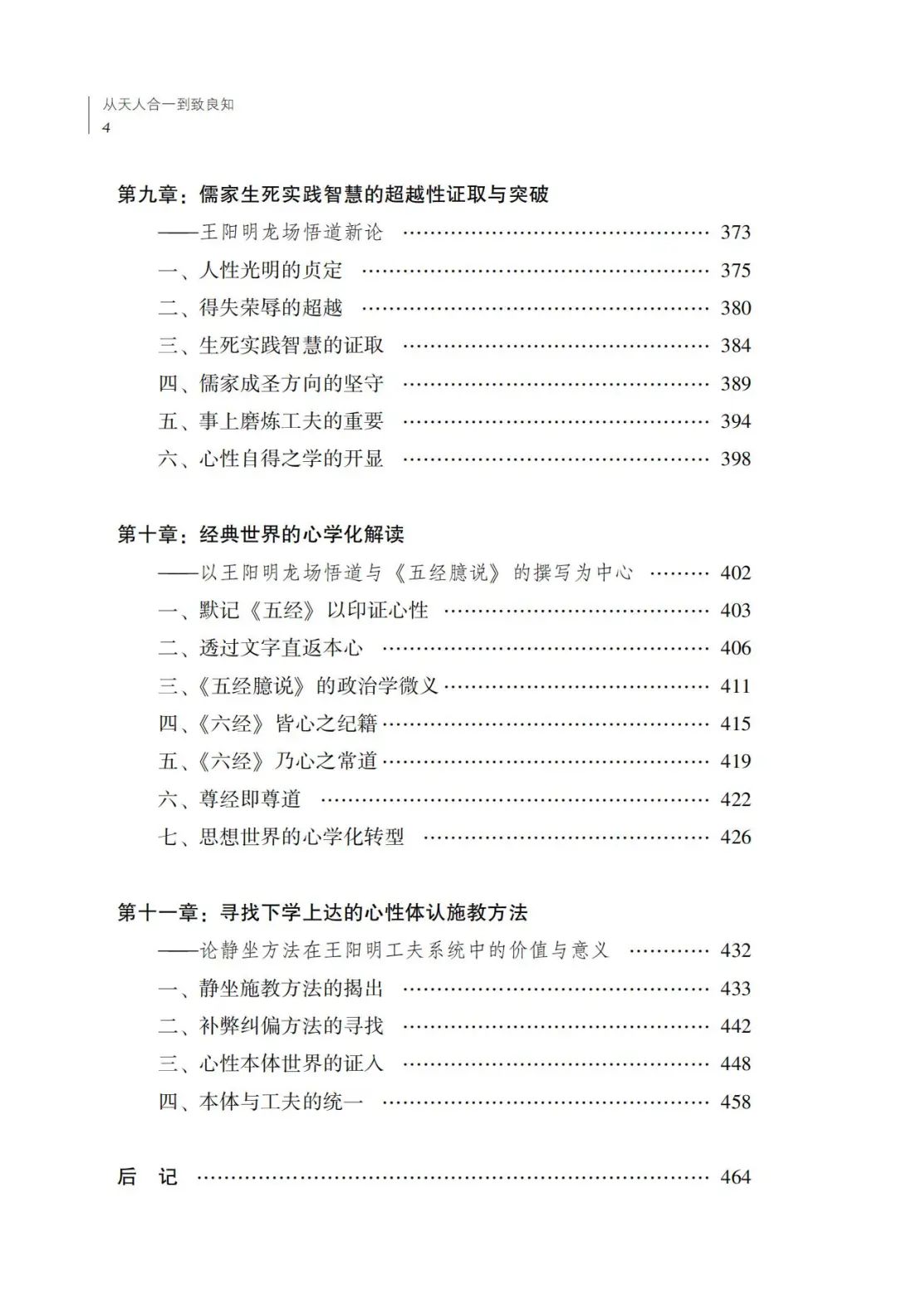 本書凡三編,共十一章。上編主要討論先秦儒家的“天人合一”思想、傳統儒家天命與人生的互貫互通及其實踐取向、周敦頤思想中隱涵的“天人合一”義理旨趣、王陽明的“天人合一”與“知行合一”說等問題。中編著重分析唐宋時期中國哲學思想的發展特征、儒家心學思想世界的建構與拓展、王陽明本體實踐哲學的精義、儒家生死實踐智慧的超越性證取與突破等歷史題域。下編系統總結儒家經典世界的心學化發展方向、下學上達的致良知實踐工夫與施教方法、德性生命的實踐性展開與價值世界的建構等傳統哲學范疇與歷史變化趨勢。