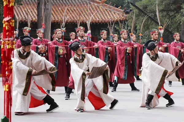 過去文廟每年都要舉行祭孔大典。在北魏孝文帝時政府已開始正式祭禮孔子,后來的隋文帝還創制了祭奠孔子的專用樂章。以后各朝代的歌詞略有變化,舞蹈也會有些許不同,但有一點相同的是,祭祀時要奏樂、唱歌、每句歌詞還配合一定的舞步。