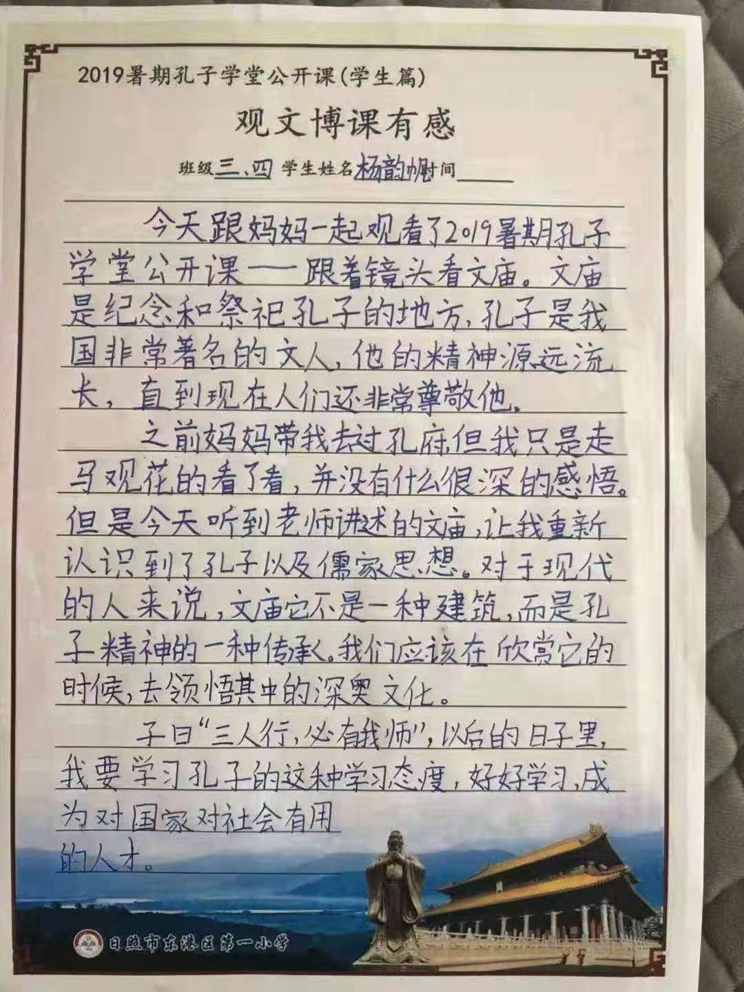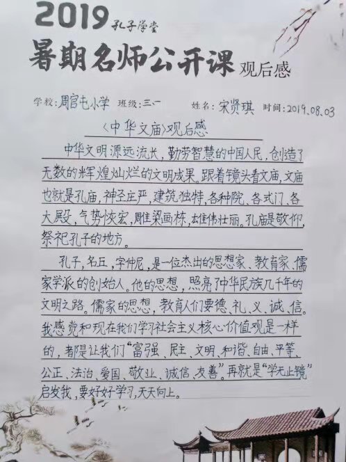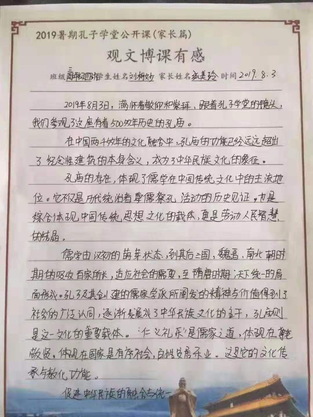 課程上線,好評如潮,不少學生、家長、老師紛紛留言評論。許多學生還撰寫了觀后感,他們表示,文廟的宏大令人震撼,身入其中不由的對傳統文化肅然起敬;如此方便的就可以學習到各類傳統文化知識,豐富了暑期生活的同時也提升了自身內涵。![]()