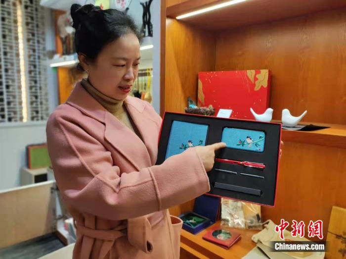 成新湘介紹湘繡文創筆記本和移動充電器。唐小晴 攝